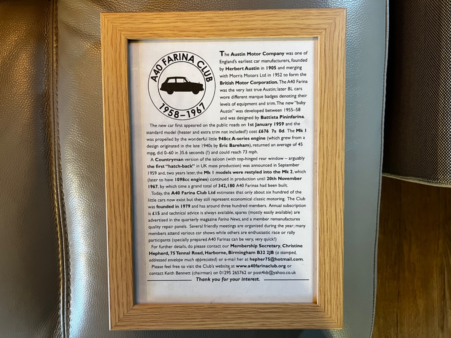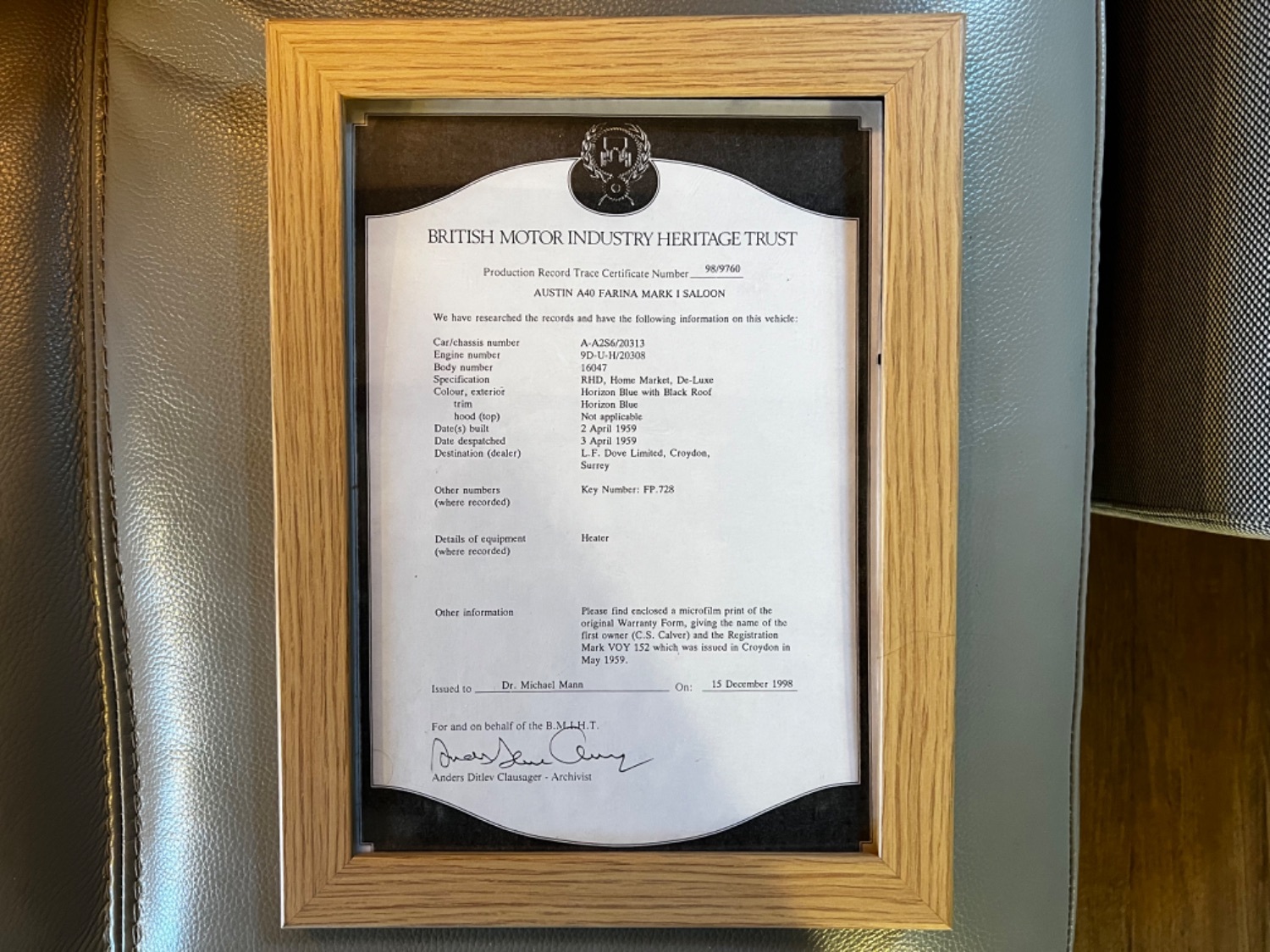 1959 Austin A40 Farina MK I Deluxe. Horizon Blue with a Black Roof and beautiful Pale Blue upholstery. Optional extras included a heater, reversing light and windscreen washers. This wonderful Farina will be one of the best examples left in existence. As shown on the Heritage Certificate, it was built on 2nd April 1959 and registered new on 9th April by L F Dove of Croydon and given the registration number VOY182 which it still wears today. Its first owner only had the car for three years until 1962 when he died and left the car to a family friend in his will. This friend kept it for 15 years until 1977 when he passed it on to his son, a Rolls Royce engineer and long serving respected committee member of the A40 Farina Club, who kept the car for 39 years until he died in 2016. This engineer had a full body restoration carried out on the car in 1992 by Auto-Renovations of Chesterfield with new panels supplied by the Radford Panel Company of Warwick. The original invoices for this work at a cost of £2511. 74 are in the history file. Since this work the car has only covered around 10000 careful miles travelling to dozens of classic car shows of which details are in the history file. It has been a prize winner on more than one occasion. In March 2007, the long term owner had a full engine rebuild at a cost of £1224. 27 and since then the car has only covered 3302 miles. In November 2013 it was featured in seven page article in Practical Classics magazine testing Swinging Sixties saloons. Two copies of the magazine are included in the history file. The current MOT runs until June 2023 although it is now MOT exempt and the car will have a fresh mot applied upon sale. The car has covered just 60,000 miles from new. The very large history file contains the current V5, copies of previous V5s, the current MOT certificate, lots of previous MOT certificates dating back to the 1970s confirming the low mileage as correct, also a huge amount of invoices for parts and work completed, insurance policies over many years and lists of classic car shows attended along with a charming hand-written fuel log book. A lovely charming car that is ready for its next adventure. Absolutely any inspection welcome. All major debit and credit cards accepted. Part exchange considered. Finance arranged. Free U.K mainland delivery. Please contact us for further information. Lots more pictures and a video on our website and Facebook pages.