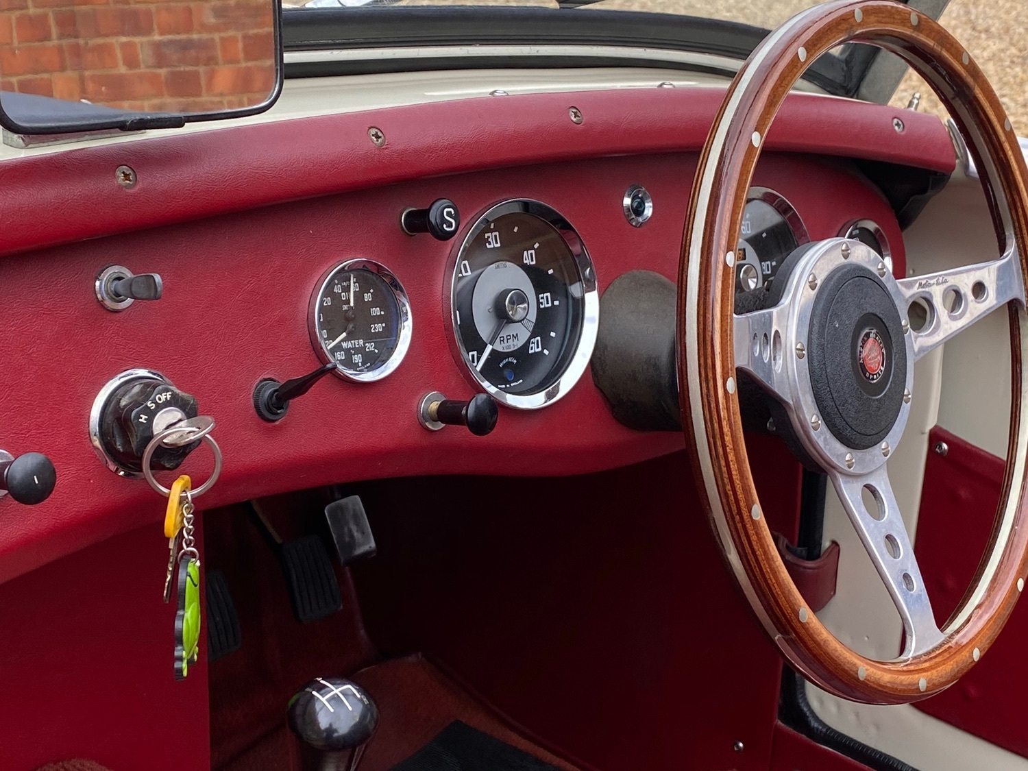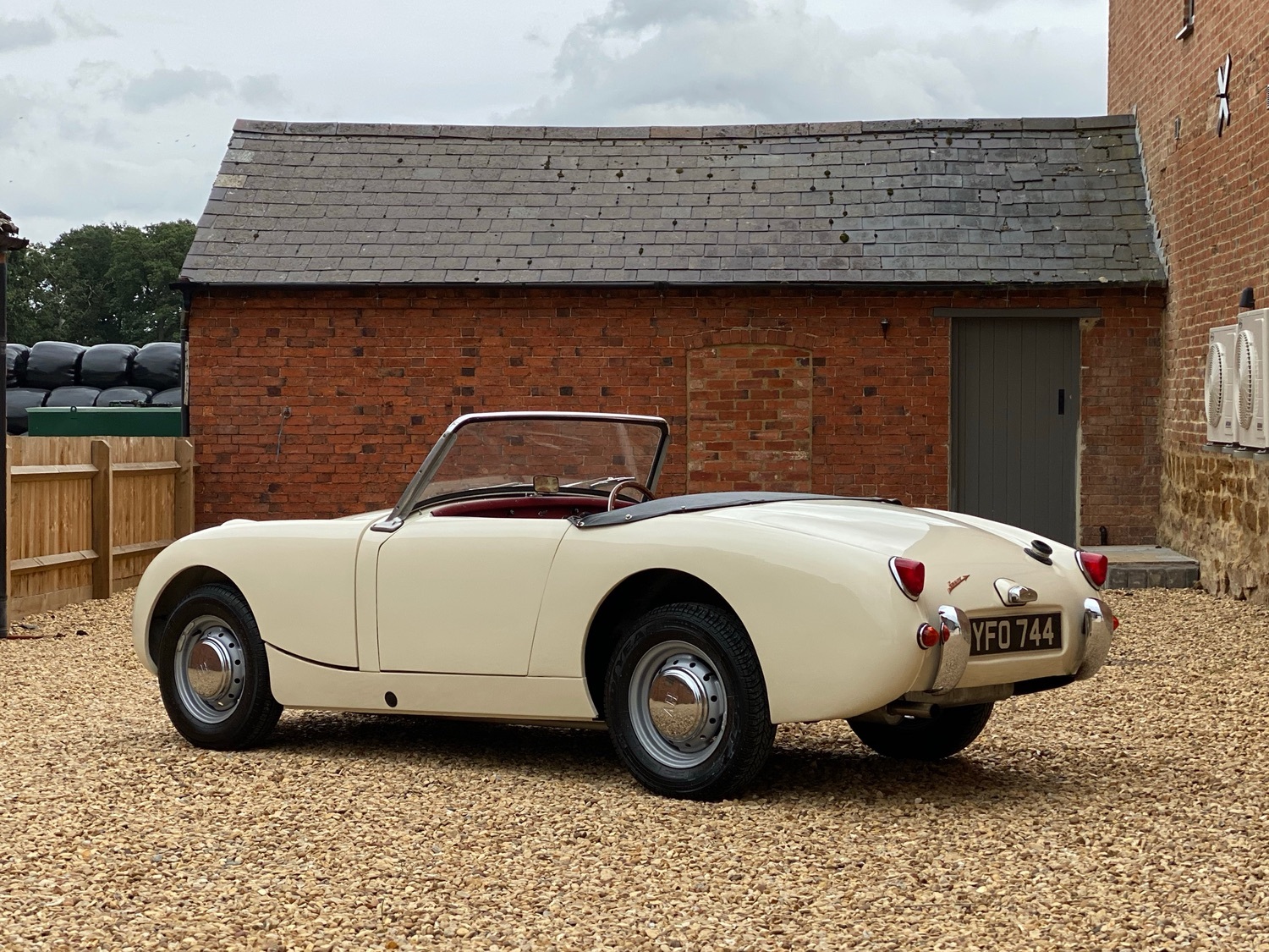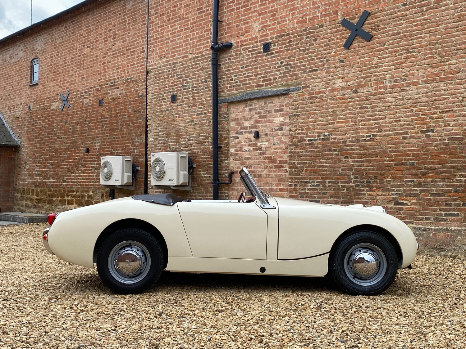 1959 Austin Healey Frogeye Sprite. Old English White with red leather upholstery and a black hood, sidescreens and full tonneau. A lovely original U.K right hand drive Frogeye retaining its 948cc engine and correct smooth case gearbox. The car was Subject to restoration work during 2017 and is still in beautiful order today having covered less than 1000 miles since. Lots of money has been spent on the car and a new fuel tank, sports coil, front brake shoes and cylinders and new tyres were fitted less than 100 miles ago with an invoice totalling over £750. The car drives just as you would expect, great fun and a real performer around the country lanes, a sports exhaust system means the car sounds fantastic and gives you that little extra performance. The car comes complete with a comprehensive history file which contains a large amount of bills, invoices and old mots going back many years. This is a very well sorted Frogeye that just needs enjoying, all the work has been done for you. Absolutely any inspection is welcome. All major debit and credit cards accepted. Part exchange considered. Finance arranged. Free U.K mainland delivery. Please contact us for any further information.