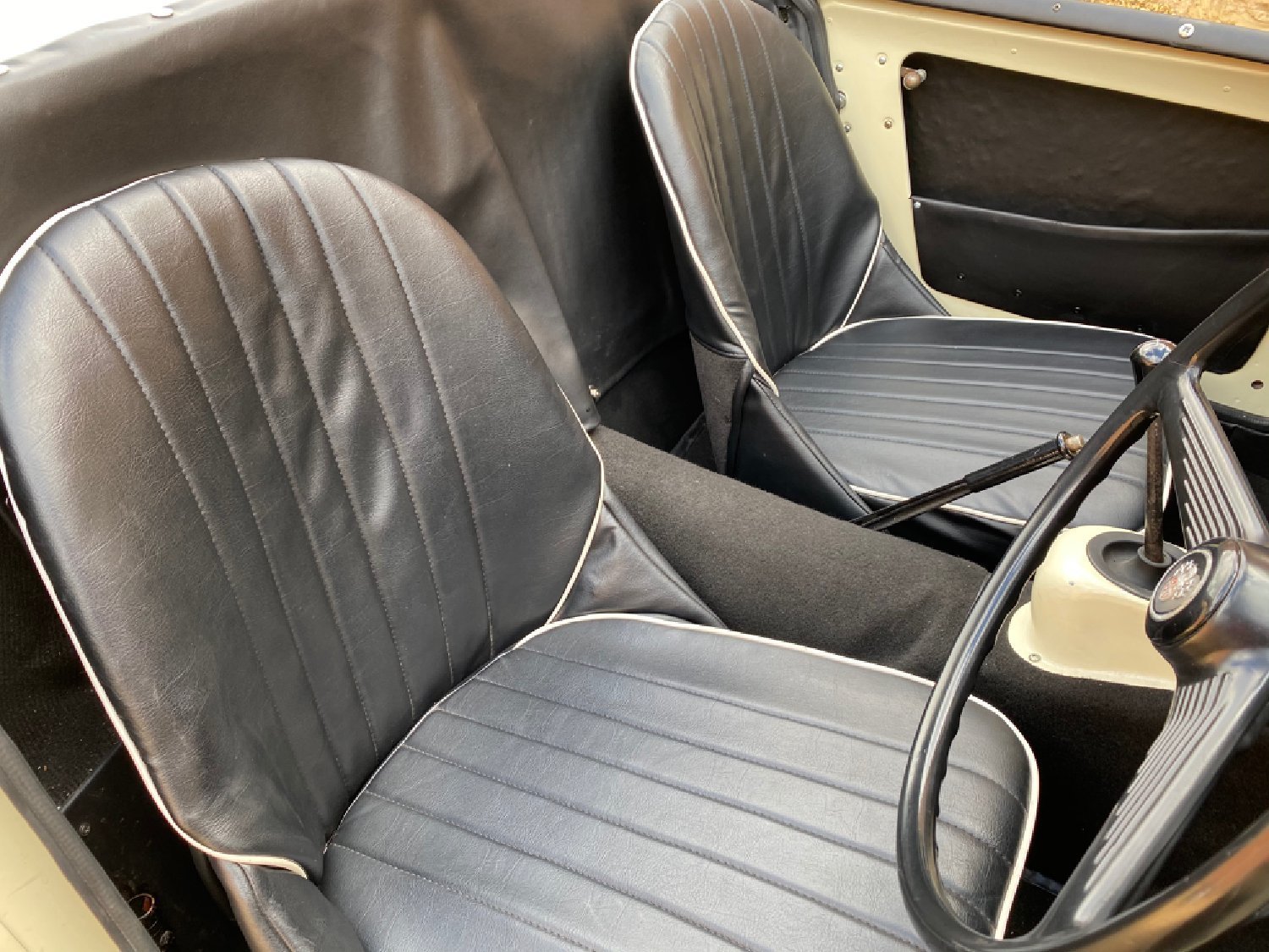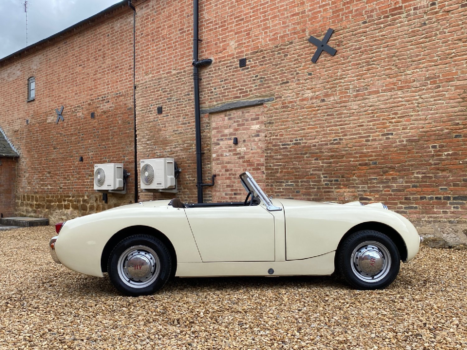 1961 Austin Healey MK I Frogeye Sprite. Old English White with Black upholstery with white piping and a new black hood and side screens. According to the Heritage certificate in the history file the Sprite was built in April 1960 and despatched to the U.S the same month. The car spent its life in America until 2018 when it was repatriated from sunny California and subject to a complete nut and built restoration, it is a matching numbers car and no expense was spared and the work carried out included stripping the car completely to a bare shell, fully prepped and repaired where necessary, reassembled paying special attention to the shuts and gaps. The engine was completely rebuilt with new mains and big ends, valves ground in and new double springs. A duplex timing chain and gears were fitted along with all gaskets, water pump and hoses and new engine mountings. Original smooth case gearbox was fitted with new slave cylinder and all synchromesh working correctly in 2nd, 3rd and 4th. A new fuse box was fitted, a rebrushed dynamo, new control box, electrical tachometer along with lights and wiring as required. The brakes were totally replaced with the fitting of new drums, wheel cylinders,shoes,hoses and pipes. Dual master cylinder and handbrake cable. The front suspension was completely stripped, cleaned, painted and reassembled with all new bushes and new steering rack. The rear suspension stripped, road springs reset with all suspension arms and bushes pressed in. A new fuel tank was fitted along with all hoses, pipes and filters, an SU pump, carburettors serviced and a complete exhaust system fitted. A brand new black hood was purchased along with side screens and also replaced were new seat squabs, seat covers, door panels and dashboard. The boot area carpeted. We have invoices on file for all the parts purchased during the rebuild as well as a lovely photographic record of the restoration. The car has only covered 600 miles since all of the above work was completed. The Frogeye runs and drives just as you would expect from a car that has been rebuilt to such a high standard and is a car perfect for either the collector or enthusiast to enjoy. Although now mot exempt a fresh mot will be applied upon sale for your own peace of mind. Absolutely any inspection is welcome. All major debit and credit cards accepted. Part exchange considered. Finance arranged. Free U.K mainland delivery. Please contact us for any further information.