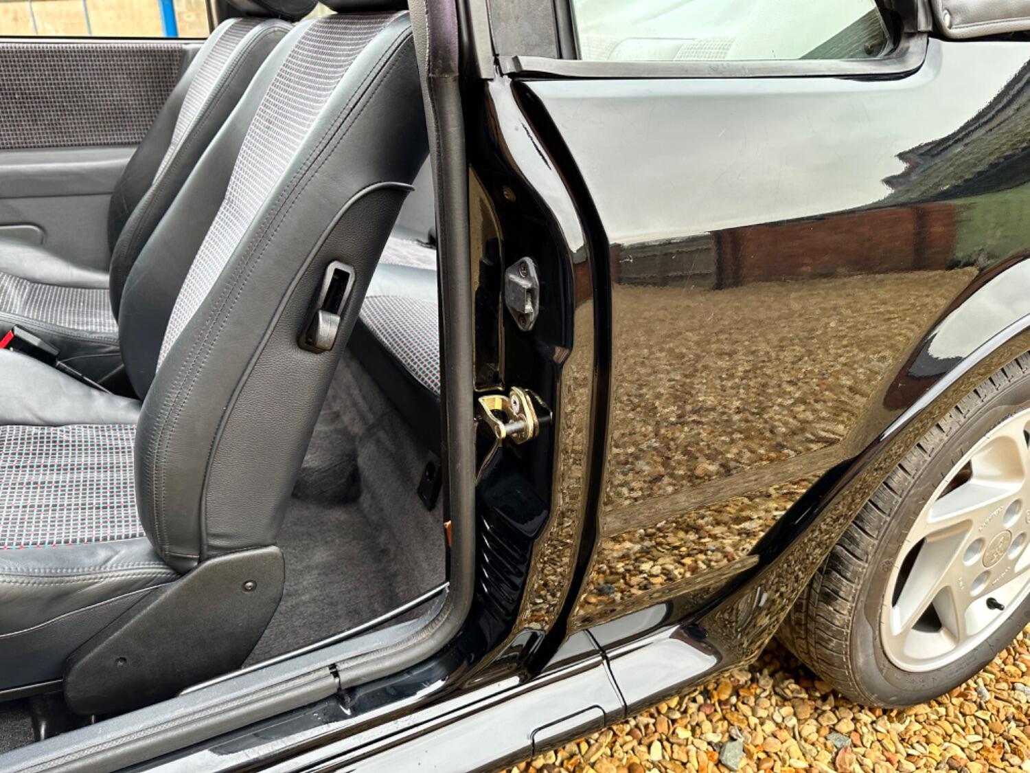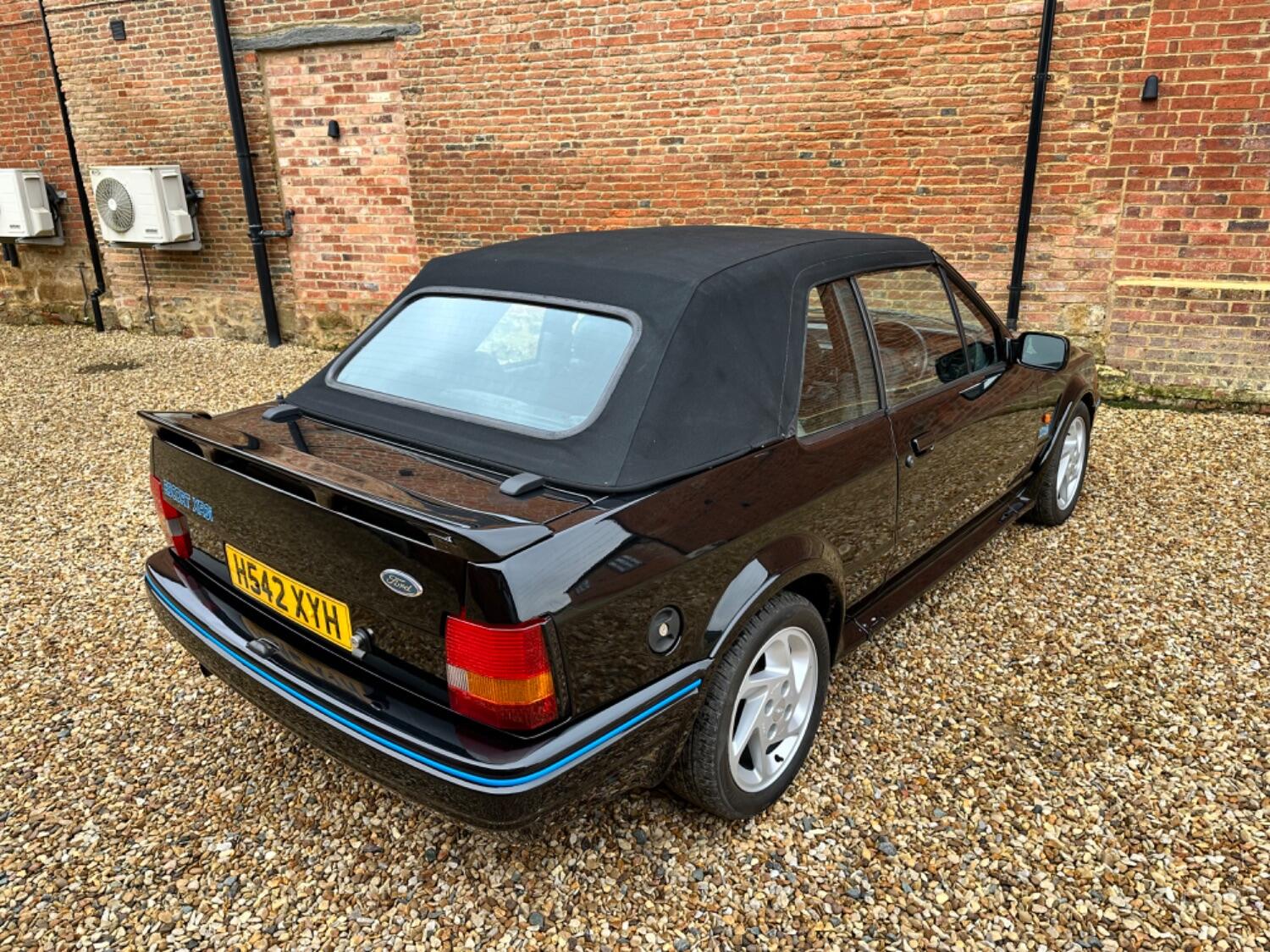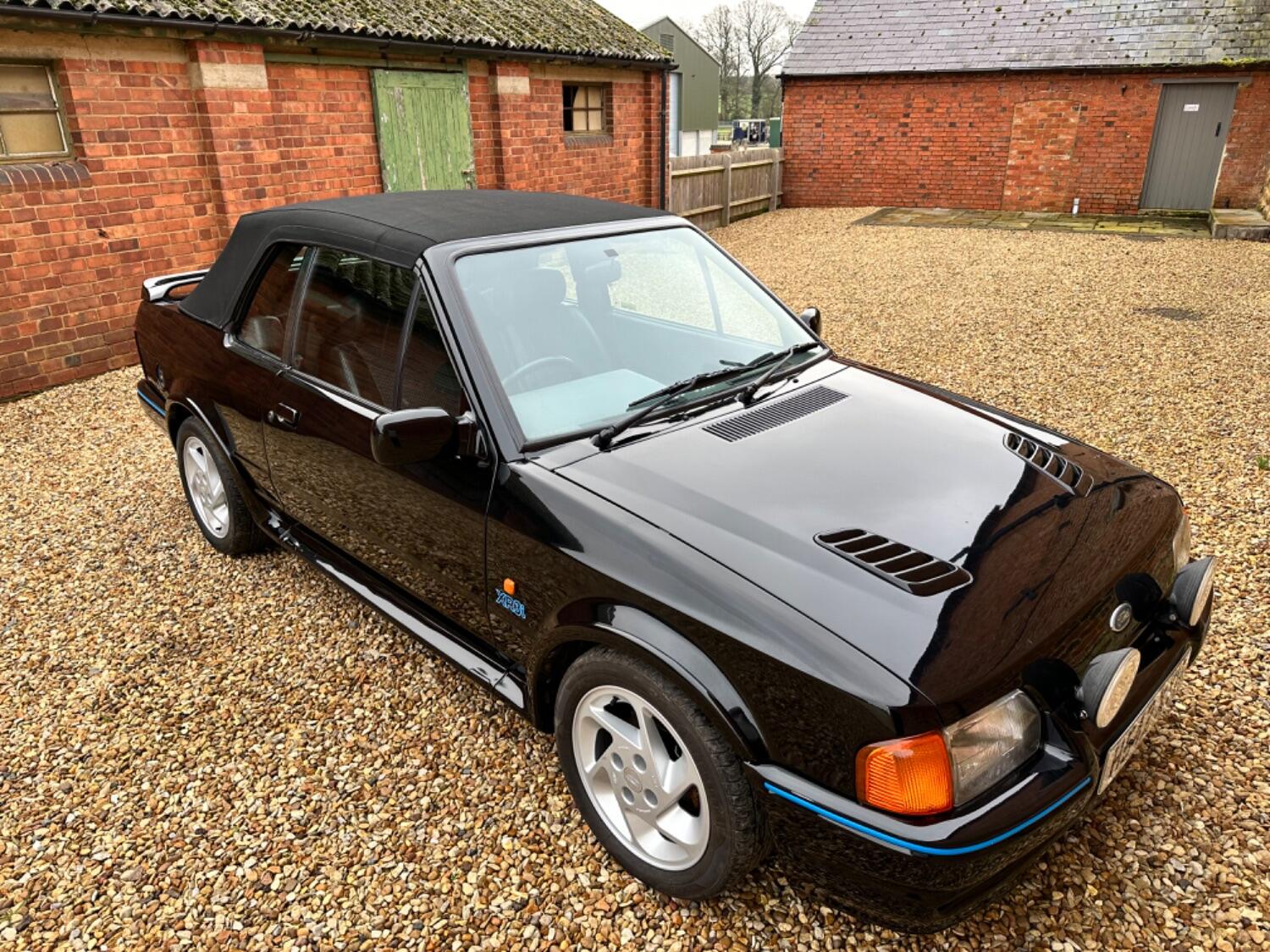 1990 Ford Escort XR3i Cabriolet. Black with Shadow half leather upholstery and a black mohair electric hood. This stunning XR3i is fitted with a full RS Turbo body kit and wheels which we believe has been fitted from new and has been with its last keeper for 15 years. It has had just 3 former keepers from new and has a recorded 56,000 miles from new. The car was subject to a restoration six years ago which included a full bare metal respray and an engine rebuild and has covered less than 500 miles since. The original dealer wallet is still with the car and retains all handbooks and manuals as well as the service book. The supplying dealer assurance certificate shows that it was supplied by Currie Motor London Ltd on 1st August 1990 to Mr Murphy of London. In beautiful all round condition this Ford has clearly been cherished and has been well cared for over its lifetime. Running and driving just as you would expect the 1.6 EFi is very responsive and the 5 speed gearbox smooth and precise. The electric soft top works correctly as do the electric windows and all gauges and dials functioning. It is also fitted with a heated front screen and has a tonneau cover. This is a very genuine unmolested car that still retains its original specification and looks as it did in the showroom 34 years ago. A fresh mot will be applied upon sale for your own peace of mind. Absolutely any inspection welcomed. All major debit and credit cards accepted. Part exchange considered. Free U.K mainland delivery. Please contact us for any further information. Lots more pictures and a video on our website and Facebook pages. Usual dealer facilities including secure storage and transport solutions for import / export.