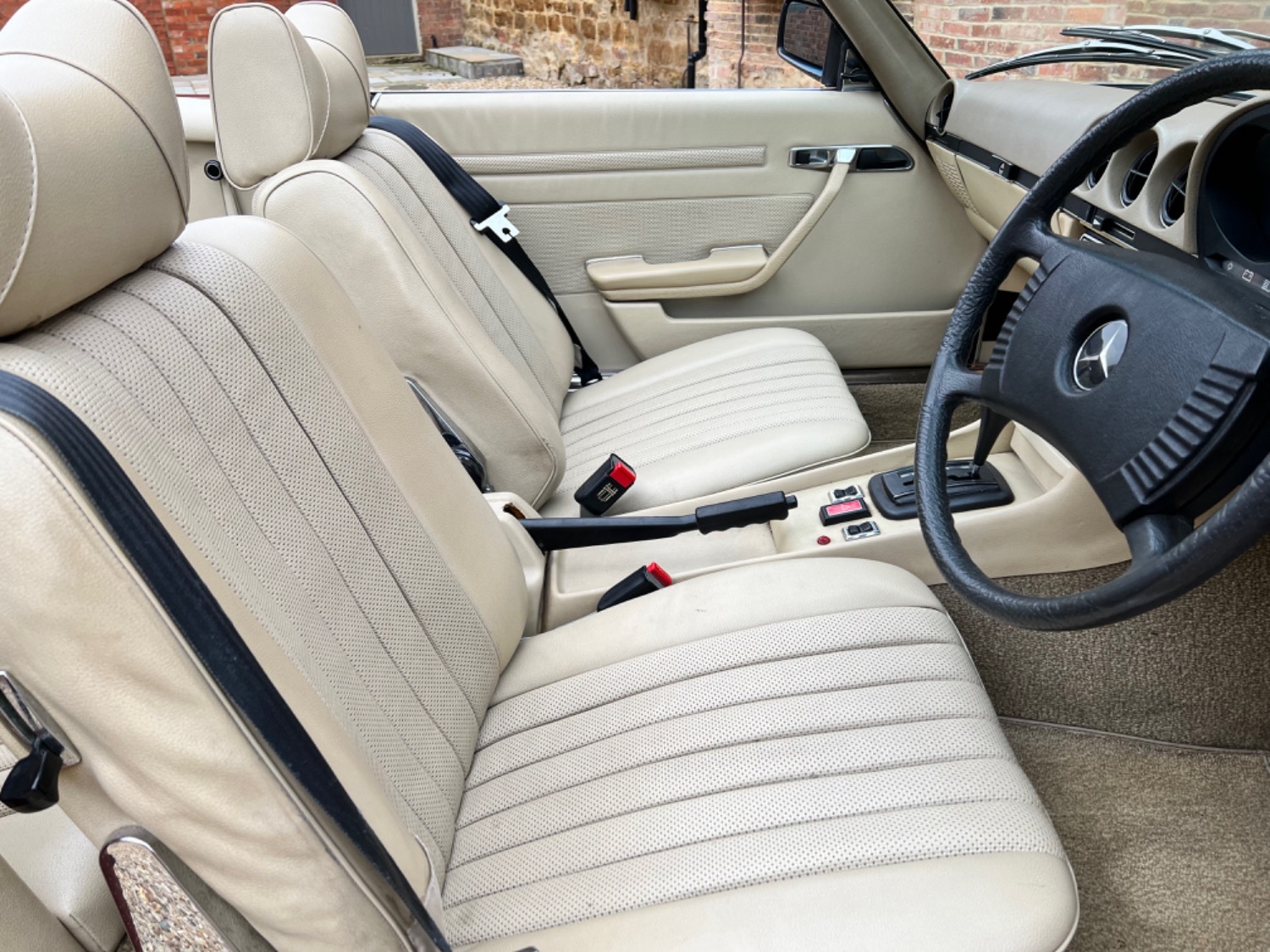 1976 Mercedes Benz 350 SL Automatic. Medium Red with Barley upholstery, Black mohair hood and factory hard top. First registered on 1st August 1976 and with its last owner since 2010, some 11 years. It has covered just 62,000 miles from new and comes with lots of old MOT certificates dating back to 1985 confirming the mileage. The Mercedes has been loving cherished during its life and the photographs speak for themselves with no expense spared. On the road the SL performs just as you would expect a car of this standard to, the V8 engine is very strong with plenty of pulling power and the automatic gearbox is smooth and precise making this car very capable in modern traffic. The R107 models are now becoming very desirable and we have seen a sharp rise in their values over the last couple of years so we see them as sound investments. Although now tax and mot exempt a fresh mot will be applied upon sale for your own peace of mind as well as a 60 point inspection carried out by an independent workshop. The car is also ULEZ exempt. With power steering and electric windows it could easily be used as a daily driver as well as your weekend pleasure. A car that any collector or enthusiast would be please to own. Absolutely any inspection is welcome. All major debit and credit cards accepted. Part exchange considered. Finance arranged. Free U.K mainland delivery. Please contact us for any further information.
