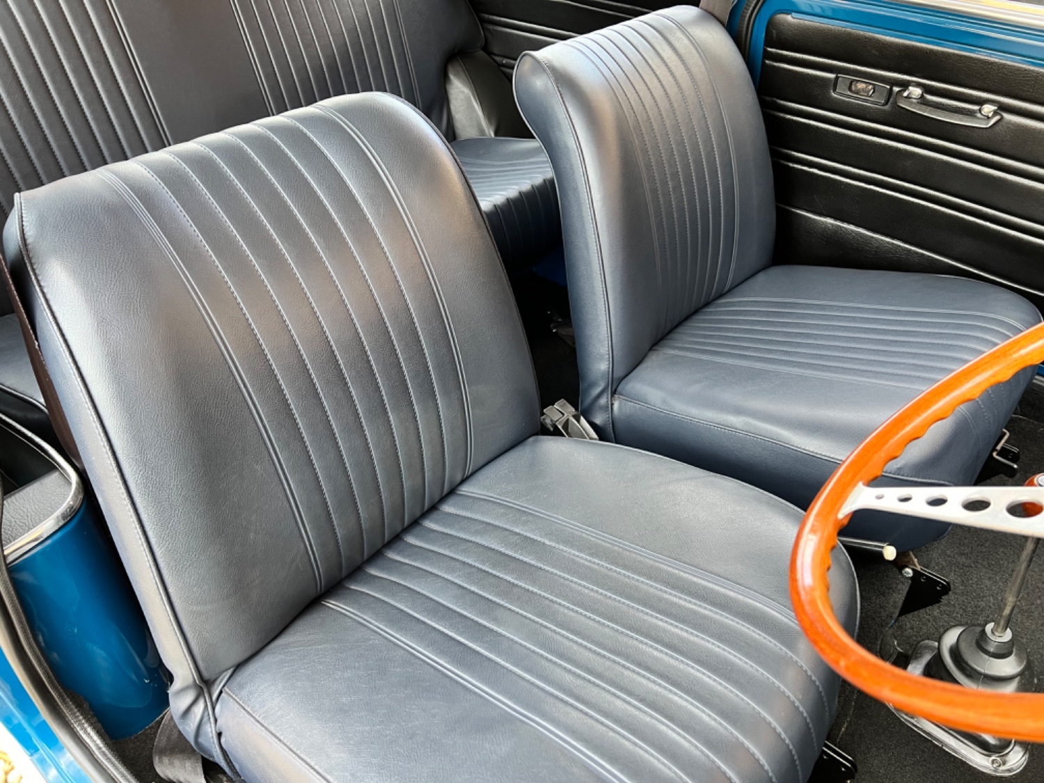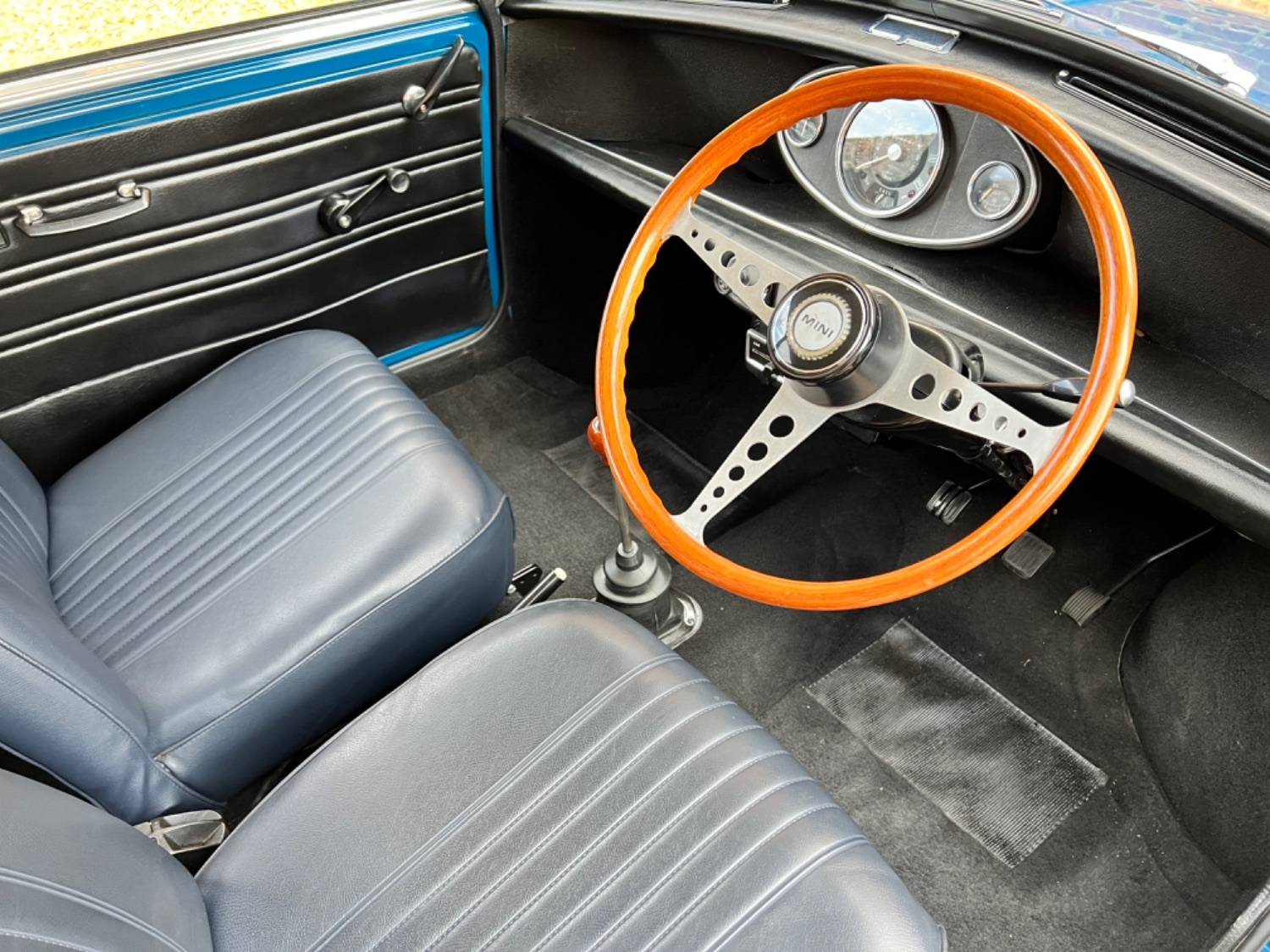 1971 Morris Mini Cooper S MK III 1275cc. Teal Blue with Snowberry White roof and navy upholstery. UK-supplied, right-hand drive Cooper S. Just 414 miles showing since a total ground-up restoration.