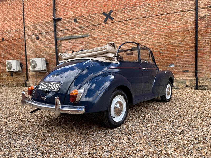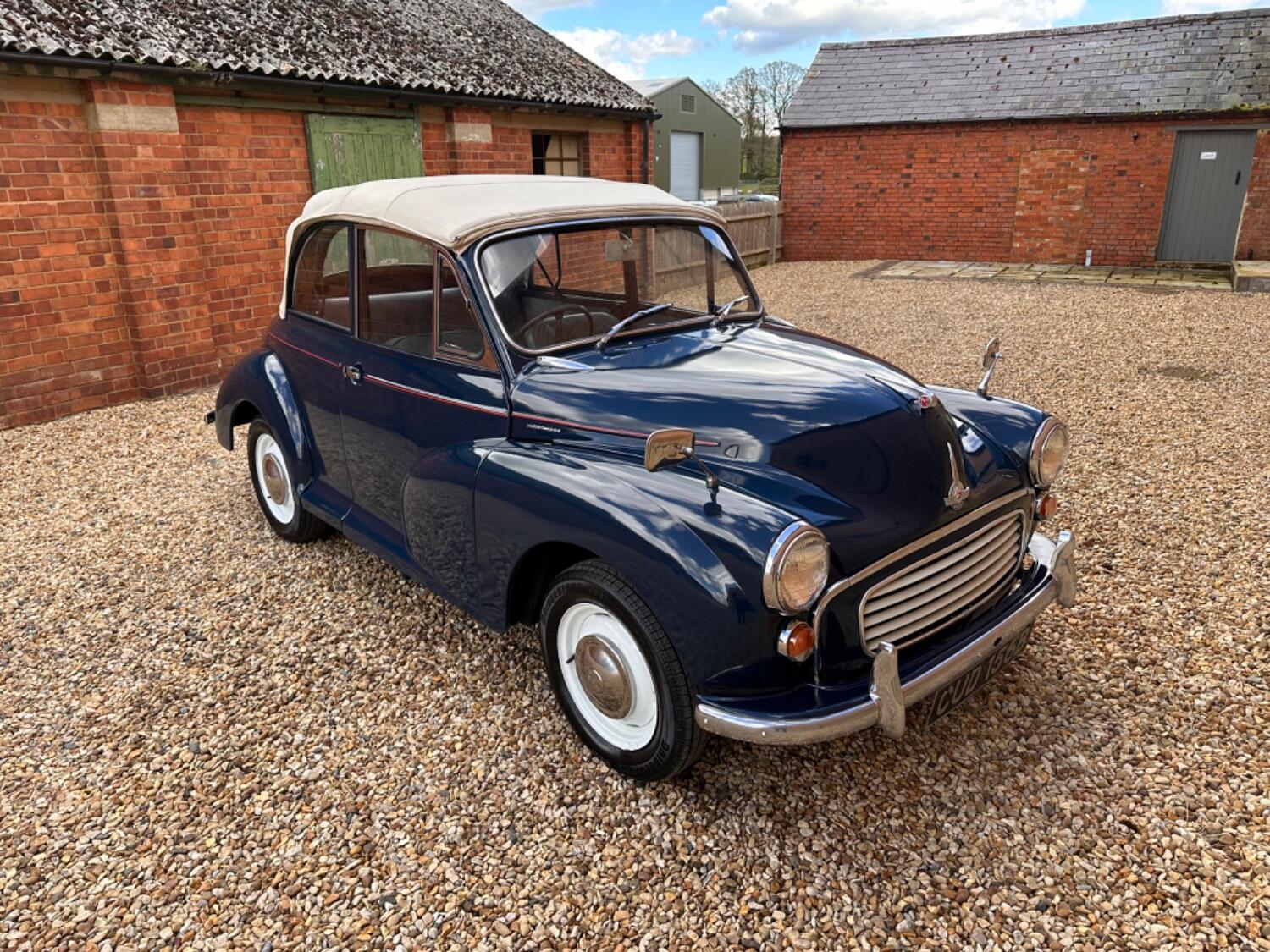 1964 Morris Minor 1000 Convertible 1098cc. Trafalgar Blue with blue ambla upholstery and a white soft top. This genuine factory convertible with the correct MAT chassis number has been with its last owner for 8 years and is in lovely all round condition. It comes with a large history folder containing many bills and invoices, a huge amount of old mot certificates, and the original green log book which shows the Morris still retains its original registration number. The car was subject to a restoration in 2005 when lots of new parts and panels were fitted with all invoices on file. Lots of work has been carried out over the years which includes a complete engine overhaul and converted to run on unleaded fuel and a telescopic front damper kit. The car is very solid throughout with no signs of any corrosion and a strong chassis. Running and driving just as it should and with the distinctive exhaust parp that only Morris Minors have. Just waiting to be enjoyed in new hands for those lovely sunny days out. Although now tax and mot exempt a fresh mot will be applied upon sale for your own peace of mind. Absolutely any inspection welcome. All major debit and credit cards accepted. Part exchange considered. Free U.K mainland delivery. Please contact us for any further information. Lots more pictures and a video on our website and Facebook page.