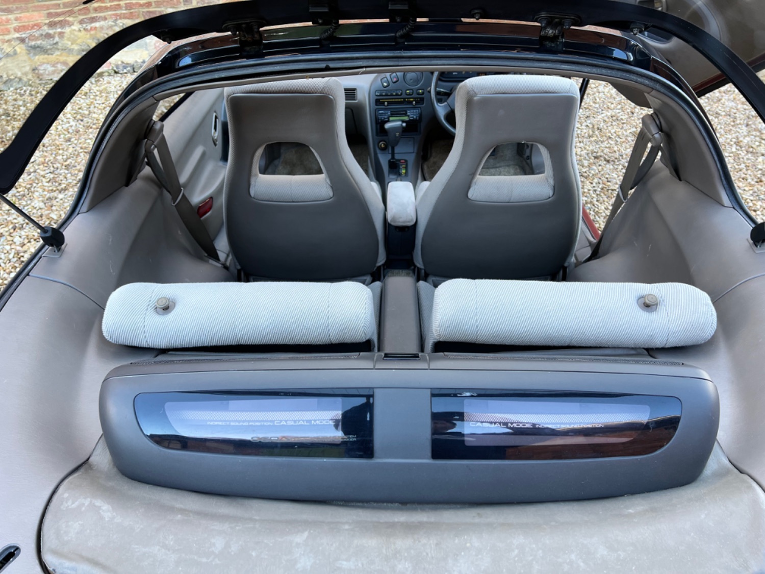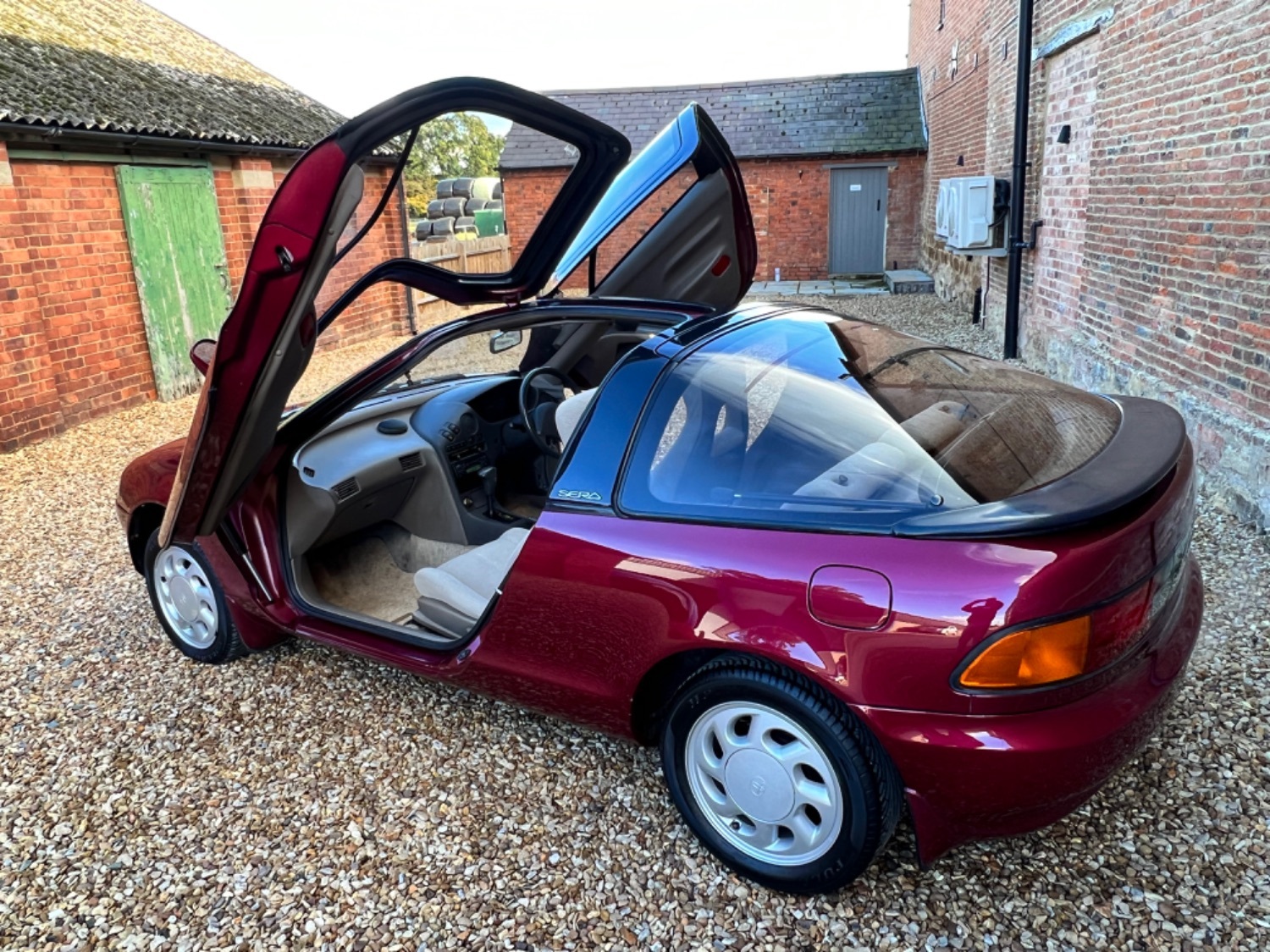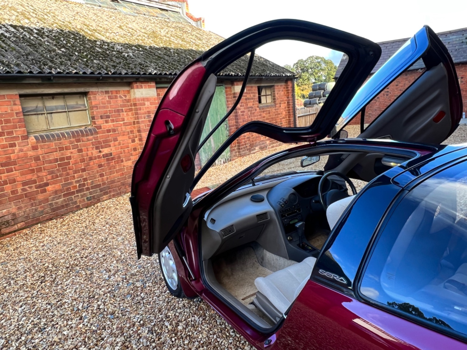 1990 Toyota Sera 1.5 Automatic Phase 1. Wine red mica metallic with grey cloth upholstery. A fantastic quirky car from Toyota that was built only for the Japanese market. This Sera has been with its last owner since 2014, some 7 years and covered just 86,000 miles from new. During this ownership it has been enjoyed and used sparingly covering just 6,000 miles. The styling is quite unique, with lots of glass and gull wing doors... a cool fact, the designer Gordon Murray cited this door design as inspiration for the McLaren F1's door arrangement. It was also one of the first production cars to have projector headlights. This Sera also has some factory options which include Super Live Surround Sound (SLSS), Air filtration/fragrance system and Smoked perspex upper spoiler (not currently fitted). The original blinds are also with the car. The paintwork is very bright and presents very well with just a few stone chin-ups on the bonnet. The distinctive glass canopy bathes the interior in natural light, creating a welcoming ambience throughout the cabin. The grey cloth seats with integrated headrests are in very good condition, with no rips, tears, or even any significant bolster wear on either of the front seats. Period-correct Sera floor mats are also present. Mechanically the car is very strong and drives like a car much new we than it really is, and is hard to believe it is 31 years old. Starting on the button with typical Toyota reliability the car will come with a fresh MOT upon sale. This Toyota Sera is a rare-groove ‘90s modern classic in impressive mechanical and cosmetic condition. It would be an ideal car for exhibiting at a local and national car shows, and attracts admiring and curious glances wherever it goes thanks to those dramatic butterfly doors and wraparound glass design features. Absolutely any inspection is welcome. All major debit and credit cards accepted. Part exchange considered. Finance arranged. Free U.K mainland delivery. Please contact us for any further information.