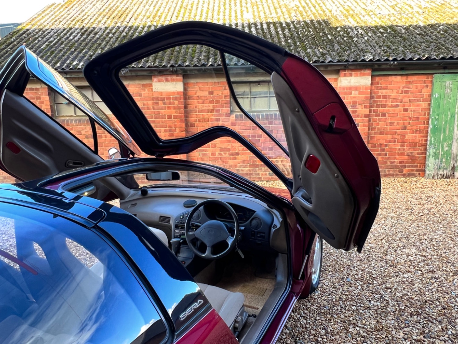1990 Toyota Sera 1.5 Automatic Phase 1. Wine red mica metallic with grey cloth upholstery. A fantastic quirky car from Toyota that was built only for the Japanese market. This Sera has been with its last owner since 2014, some 7 years and covered just 86,000 miles from new. During this ownership it has been enjoyed and used sparingly covering just 6,000 miles. The styling is quite unique, with lots of glass and gull wing doors... a cool fact, the designer Gordon Murray cited this door design as inspiration for the McLaren F1's door arrangement. It was also one of the first production cars to have projector headlights. This Sera also has some factory options which include Super Live Surround Sound (SLSS), Air filtration/fragrance system and Smoked perspex upper spoiler (not currently fitted). The original blinds are also with the car. The paintwork is very bright and presents very well with just a few stone chin-ups on the bonnet. The distinctive glass canopy bathes the interior in natural light, creating a welcoming ambience throughout the cabin. The grey cloth seats with integrated headrests are in very good condition, with no rips, tears, or even any significant bolster wear on either of the front seats. Period-correct Sera floor mats are also present. Mechanically the car is very strong and drives like a car much new we than it really is, and is hard to believe it is 31 years old. Starting on the button with typical Toyota reliability the car will come with a fresh MOT upon sale. This Toyota Sera is a rare-groove ‘90s modern classic in impressive mechanical and cosmetic condition. It would be an ideal car for exhibiting at a local and national car shows, and attracts admiring and curious glances wherever it goes thanks to those dramatic butterfly doors and wraparound glass design features. Absolutely any inspection is welcome. All major debit and credit cards accepted. Part exchange considered. Finance arranged. Free U.K mainland delivery. Please contact us for any further information.