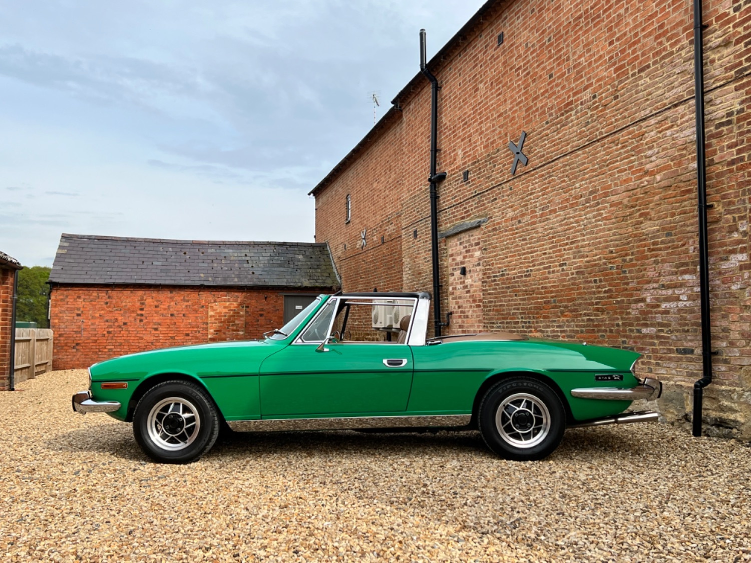 1976 Triumph Stag MK II 3.0 V8 Automatic. Java Green with Beige Ambla upholstery and black mohair hood. This lovely Stag has been with its last keeper for 9 years, had only 4 previous owners during its lifetime, some 46 years and covered just 88,000 miles. Restored in 2003 and very well cared for since the Triumph has been lavished by the last keeper over the past decade and has enjoyed many classic car shows and events. The paintwork presents very well and the upholstery very clean and tidy. The hood and frame are in great condition and operating correctly. The engine bay is nicely detailed and the engine recently receiving a retune and running sweetly with the correct oil pressure and fitted with an electric fan. A large history folder accompanies the car containing many bills and invoices detailing the restoration work including one for an engine rebuild, and has covered just 5,000 miles since. A large amount of old mot certificates also on file. The underside of the car is just as good with a very solid chassis and strong mechanicals. Although now tax and mot exempt the car has always been mot’d regularly and a fresh mot will be applied upon sale for your own peace of mind. The driving experience of a Triumph Stag is one every classic enthusiast must enjoy at least once. The V8 burble, wind in your hair and the creature comforts of power steering and electric windows, what’s not to love. A car that will be at home on the show ground or equally just being enjoyed leisurely for country outings. Absolutely any inspection welcome. All major debit and credit cards accepted. Part exchange considered. Finance arranged. Free U.K mainland delivery. Please contact us for any further information. Lots more pictures on our website and Facebook page.