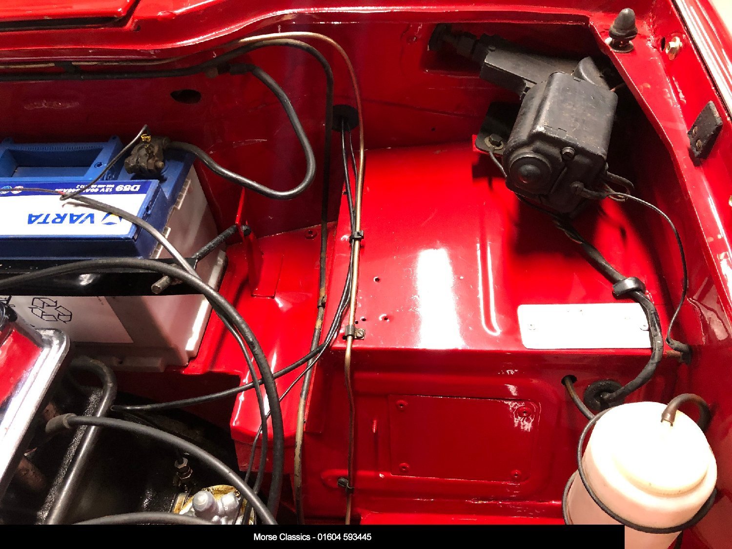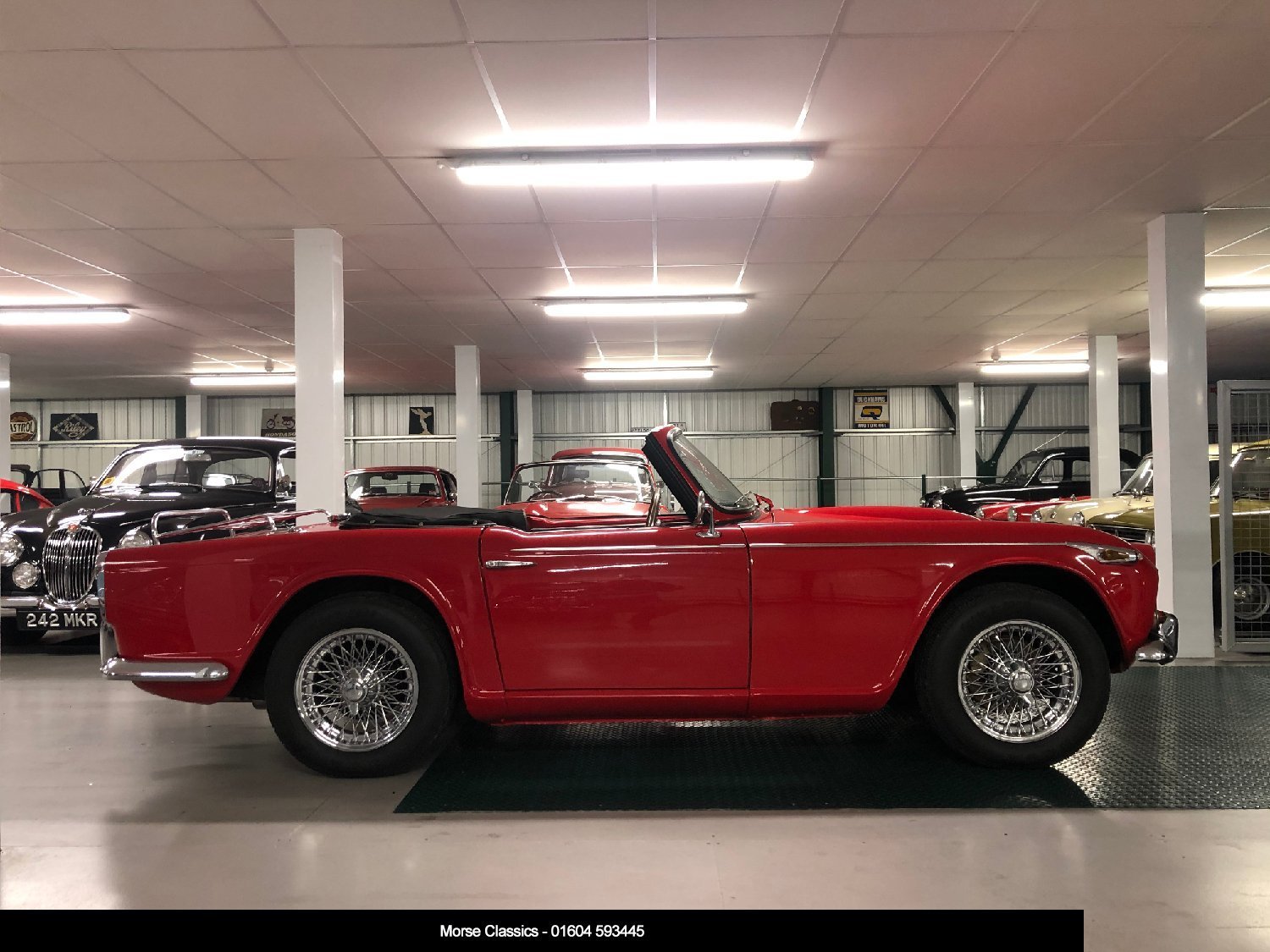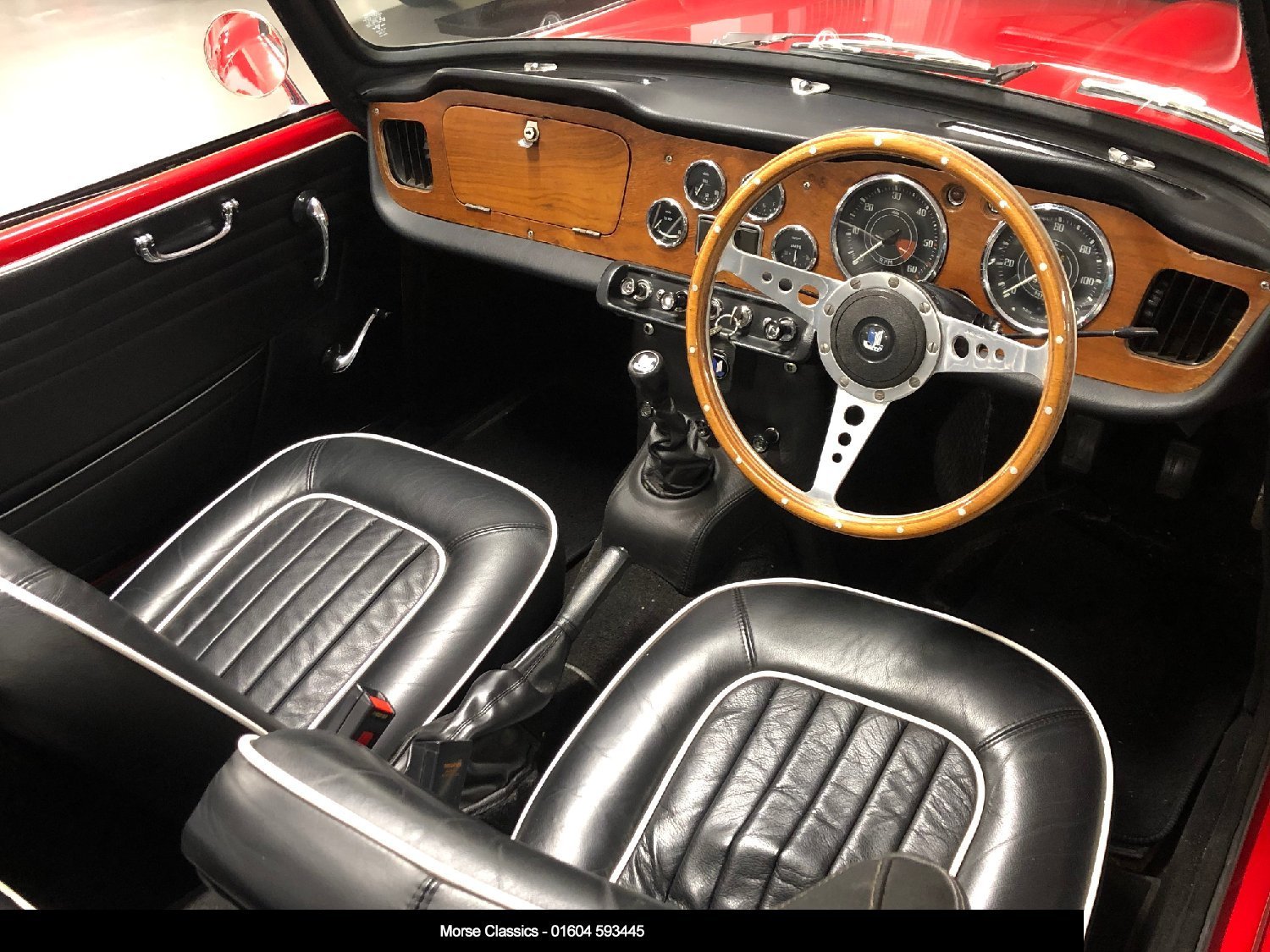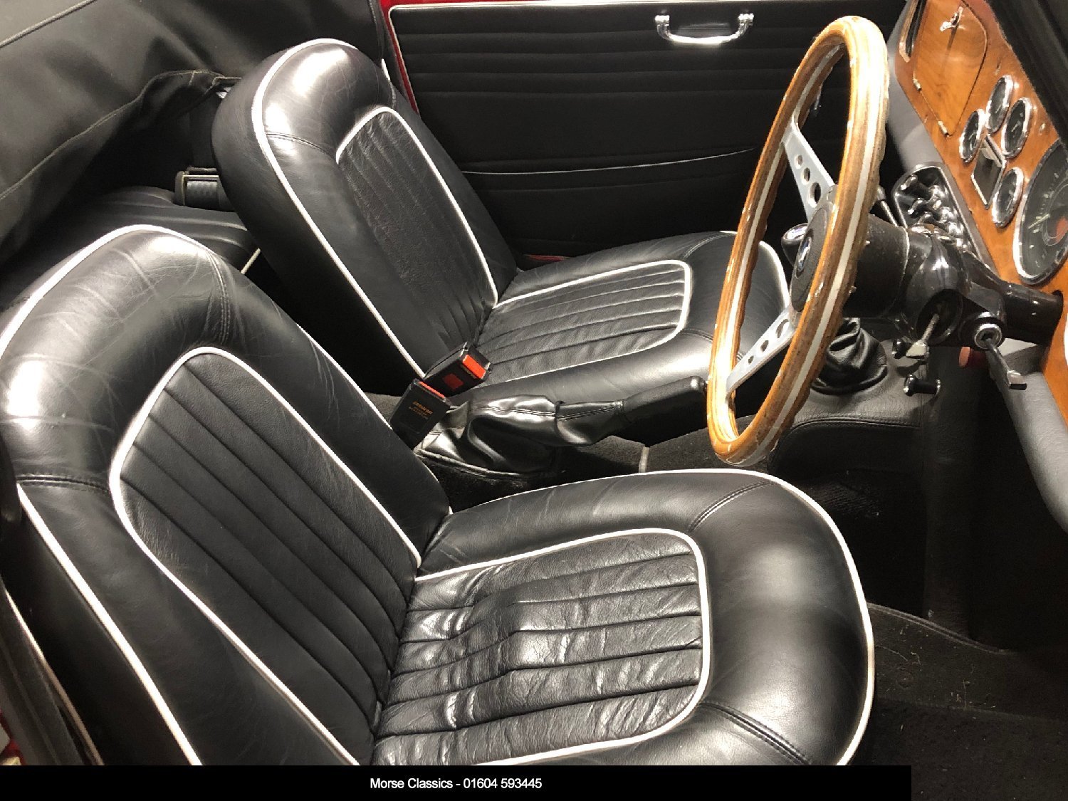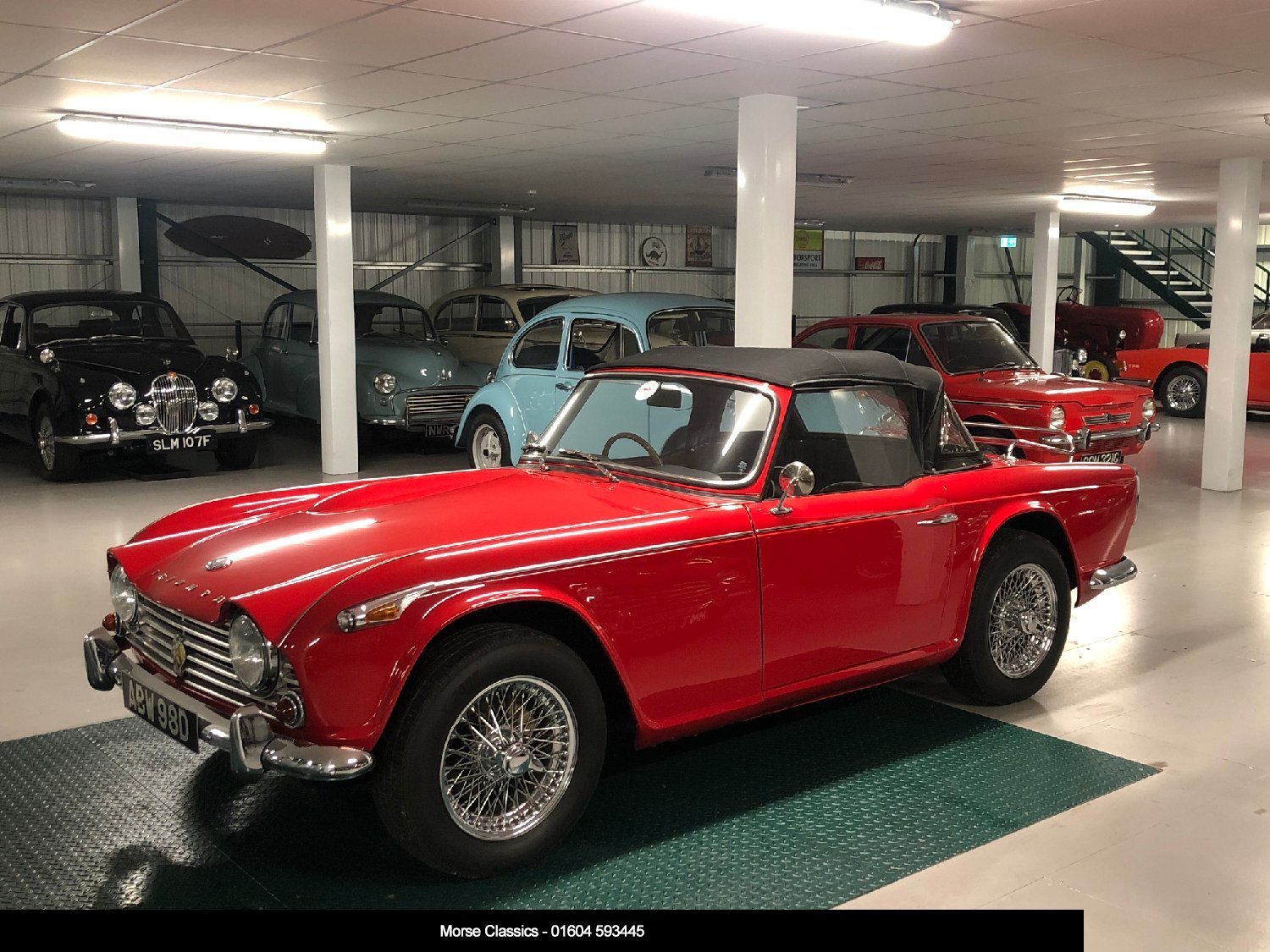 1966 Triumph TR4A IRS. Signal Red with Black leather and a black mohair hood. Produced between 1961 and 1967, the Triumph TR4 combined a new, modern and aggressive body design by famed Italian stylist, Giovanni Michelotti, with the basic chassis of the previous TR3A. The TR4 also improved passenger comfort with wind-up windows, face-level ventilation and an optional hardtop. The 2138cc engine of the late-production TR3A continued while the 1991cc engine was also made available to buyers who wanted to participate in two-litre racing. When equipped with the optional overdrive, the TR4 was good for a top speed of almost 110mph. The TR4A debuted in 1965 and introduced an all-new independent rear suspension system (IRS), which provided exceptional rear-wheel camber control with excellent wheel travel while softer springs improved the ride quality. At the Sebring 12 Hours in 1966, ample proof of the validity of the IRS was provided when three IRS-equipped TR4As achieved a remarkable 1-2-3 class victory. Today, the four-cylinder TR's are among the easiest of post-war classic sports cars to own and maintain being supported by a multitude of component suppliers and other specialists. This lovely TR4A has been part of a private collection and used very sparingly over the last few years, only coming out when the weather allowed. A very well sorted car it starts on the button and drives just as it should with a strong engine and smooth gearbox with working overdrive. The bodywork, interior and brightwork are all in super order and this is a car that will grace any showground or classic car event. Absolutely any inspection is welcome. All major debit cards accepted. Part exchange welcome. Free U.K mainland delivery. Please call us for any further information. Follow us on Facebook. Like us on Instagram. Visit www.morseclassics.co.uk