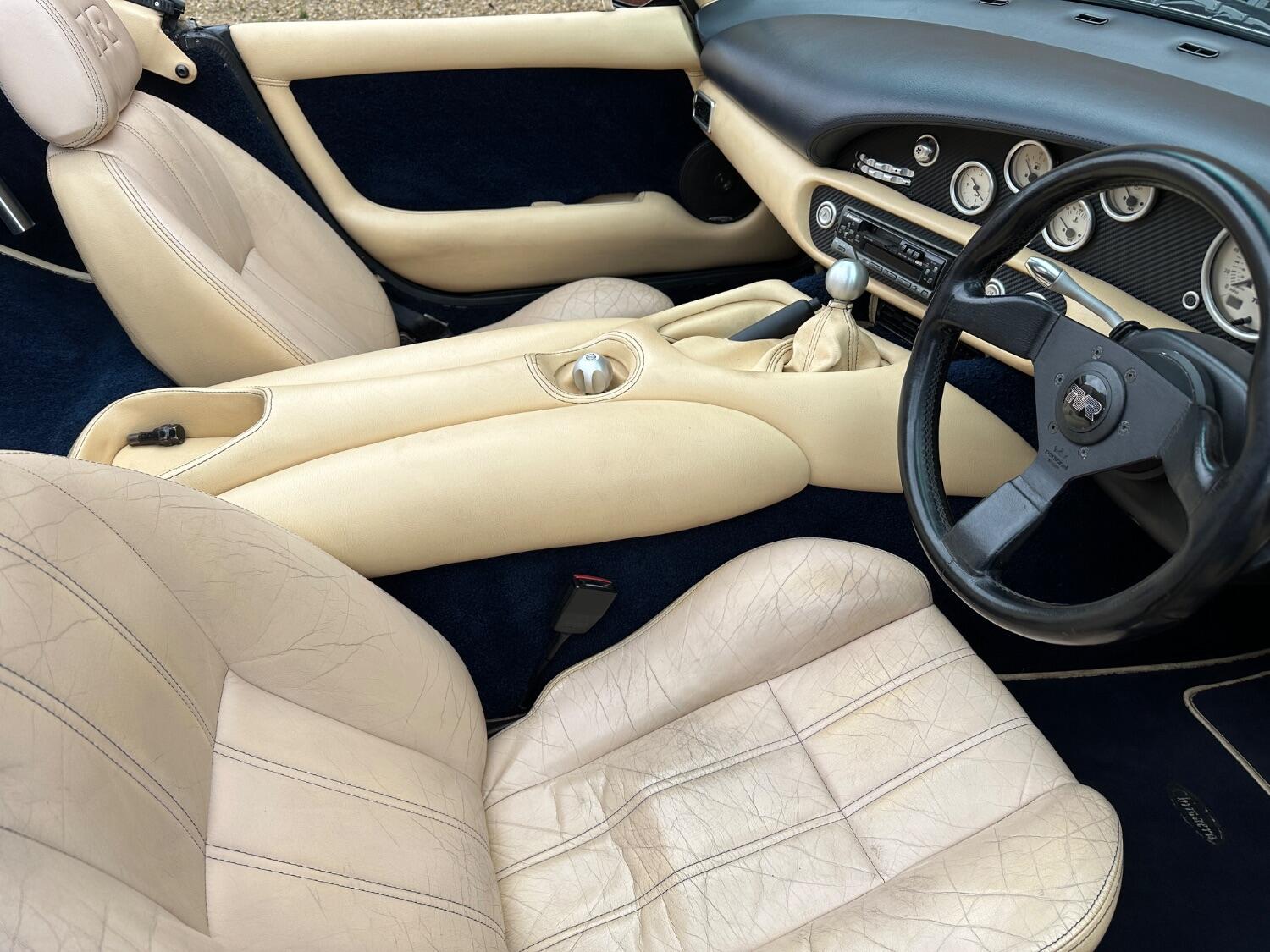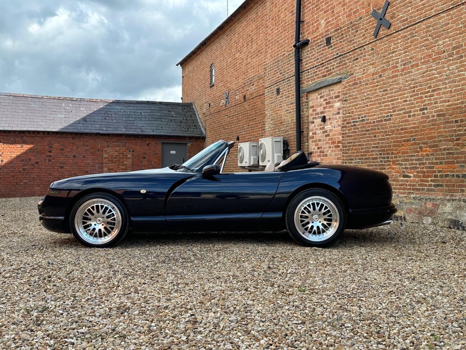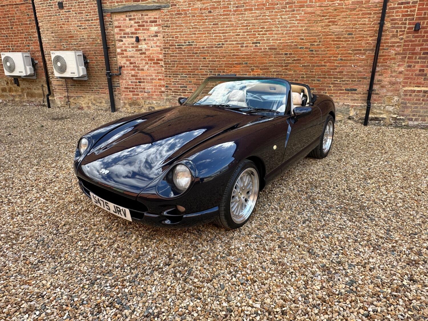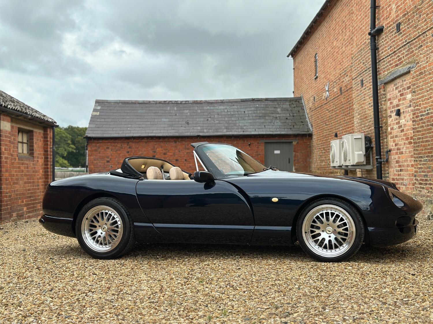 1998 TVR Chimaera 4.0 Midnight Blue metallic with Magnolia leather upholstery and black top. First debuted at the 1992 Earl's Court Motor Show, the Chimaera is an open-top roadster and uses the same backbone chassis and Rover V8 engine derivatives as the TVR Griffith. The car was intended to be the long distance tourer of the range and as such was longer, more spacious and had slightly softer suspension than its sister car. First registered on 30th October 1998 and supplied by Portfield Sports and Classics of West Sussex. It has covered just 52,000 miles from new and has been very well maintained throughout its life. Presenting very well the paintwork catches the sun beautifully and the upholstery showing minimal wear complimenting the dark blue fitted carpets. A comprehensive file accompanies the car with a huge portfolio of bills invoices and old mot certificates confirming the low mileage as correct. Also with the car is the original leather dealer wallet, handbook and stamped service book. The car has had some lovely upgrades which include 17” Multispoke split rim alloy wheels with matching tyres. A Sony CD player with remote is a lovely period feature in the car as are the metal stalks. In 2021 the car was entrusted to Sussex TVR who went through the car with all the following parts replaced, front lower and upper suspension wishbones as well as rear upper and lower suspension wishbones, front and rear anti roll bar drop links, front lower and upper wishbone ball joints, steering rack gaiters, all rubber fuel hoses, front and rear Gaz Gold shock absorbers and coil springs, front and rear brake pads and discs, front brake caliper hoses, handbrake cable, fuel pump and ignition relays, lambda sensor, drive shaft gaiters, rear exhaust mount, engine drive belt and carry out 4 wheel alignment, the total of this work coming to £5000. After purchase we sent it to a well known TVR specialist who has been through the car, they replaced the fuse box, recored the radiator, fitted a new rev counter and rectified some wiring issues with a copy of the invoice in the history file. On test drive the TVR doesn’t disappoint there either, the V8 engine is eager to please and pulls very well whilst emitting a fantastic chorus from the twin exhaust pipes, this car is a joy to drive and a real head turner Upon sale a fresh mot will be applied. Absolutely any inspection welcome. All major debit and credit cards accepted. Part exchange considered. Free U.K mainland delivery. Please contact us for any further information. Lots more pictures and a video on our website and Facebook page.